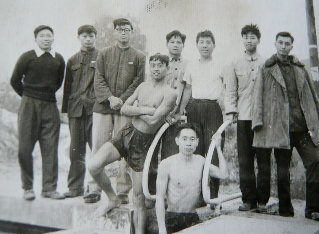 那是一個多云間陰的日子,氣溫不算太低,大約17—18度吧,來到游泳池后,只有我、蒲世民(身穿短袖汗衫者)、顧永康脫衣下水,(右起)楊鍵通、黎煌、張文棟、曹麟章、楊先學、余學文都是看客,他們有的是“旱鴨子”,有的怕冷不敢下水。