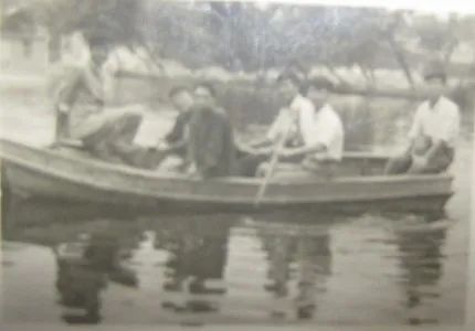 翠湖公園名不虛傳,那一湖碧綠的湖水引人入勝,憑欄觀魚躍其樂無窮,柳蔭下垂臺鉤欄,夕陽映在湖面上更是氣象萬千使人陶醉。大家一時興起,決定租船游湖,一同游湖的是:右起曹麟章、顧永康、關祖靈、袁文孝、龍長弟和我。黎煌擔任了攝影師未能在船上合影。