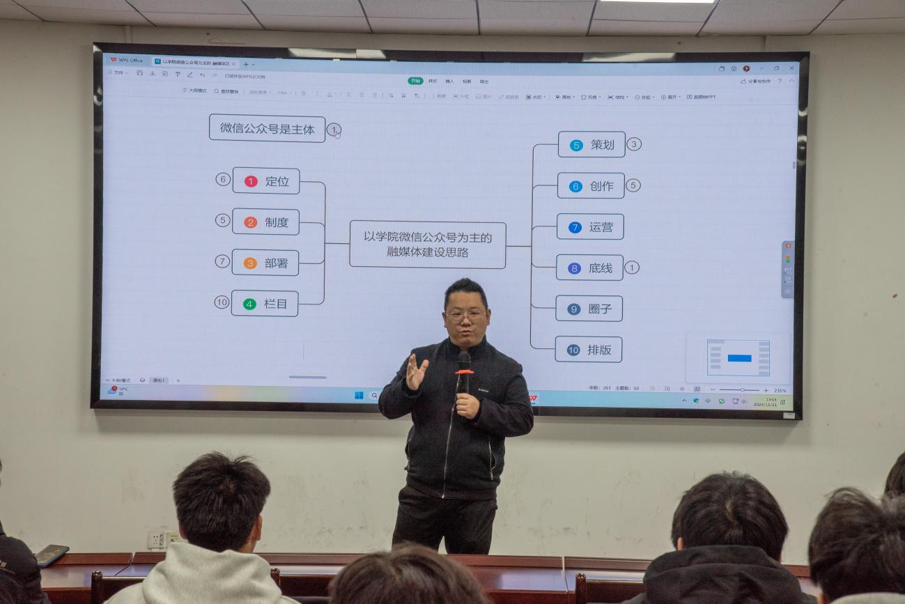 20241121日,為了提升學(xué)院融媒體成員的工作能力,為學(xué)院微信公眾號(hào)的建設(shè)提供新思路,學(xué)院邀請(qǐng)學(xué)校宣傳部龐愛(ài)忠老師在電工院609會(huì)議室為同學(xué)們進(jìn)行工作能力培訓(xùn)。學(xué)院融媒體中心全體成員、2024級(jí)全體宣傳委員參加會(huì)議。