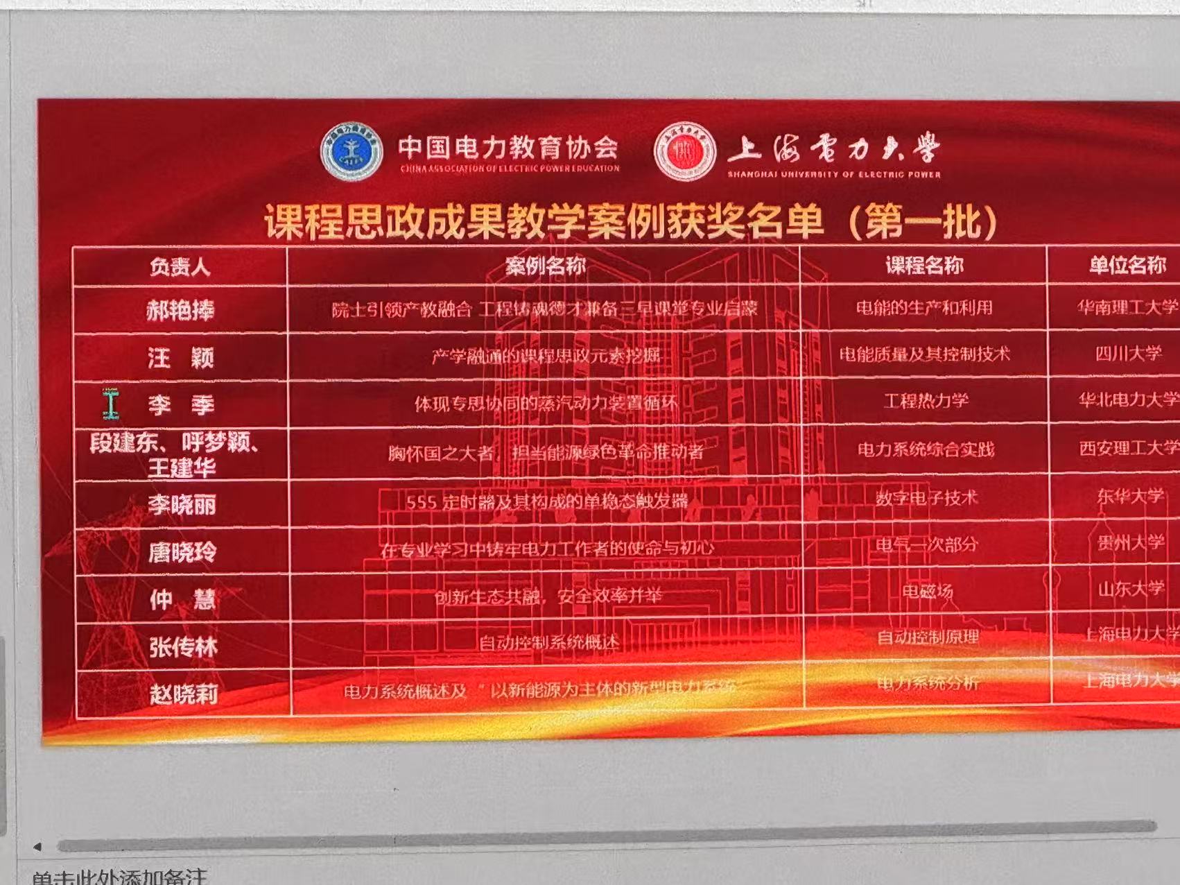 4月20日,中國電力教育協(xié)會課程思政建設工作委員會成立大會暨2024年度電力行業(yè)高等院校課程思政建設成果教學案例交流會在上海電力大學召開。學院唐曉玲老師《電氣一次部分》課程“在專業(yè)學習中鑄牢電力工作者的使命與初心”獲評優(yōu)秀案例,成為15個課程思政成果教學案例之一。